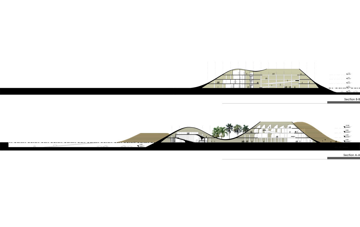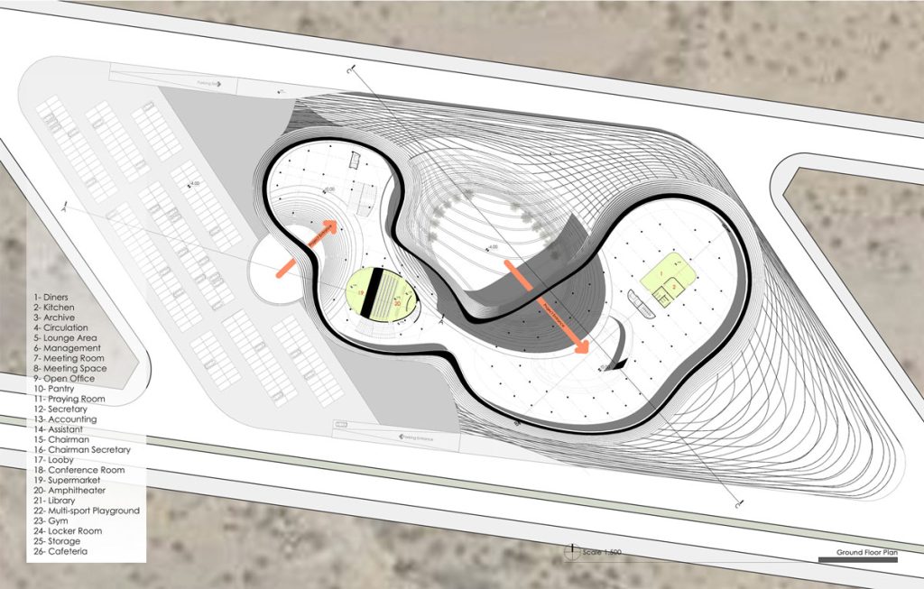 The public section, encompassing an amphitheater, library, retail space, and sports hall, is situated in an adjacent volume. Given its general nature, this section can be easily utilized outside of typical working hours. In addition to specialized halls, this section includes a multi-purpose hall and a gymnasium, with an open-air café defined above the sports area to serve as a rest and refreshment zone. Ultimately, the project successfully fosters appropriate internal connections while demonstrating a strong and multi-functional public presence within the city of Chabahar.