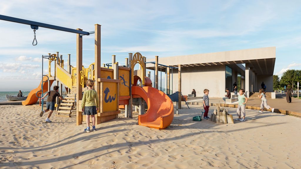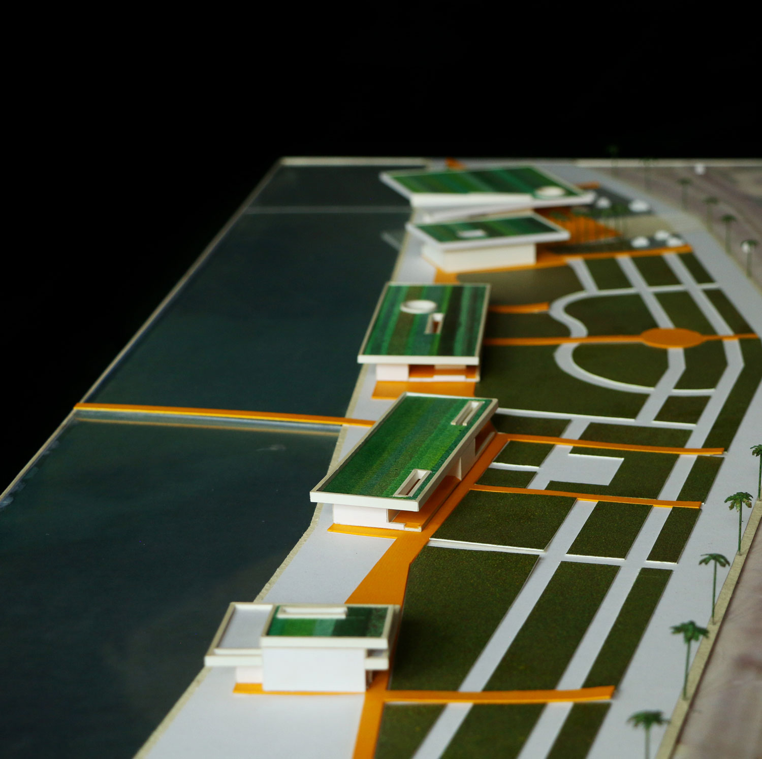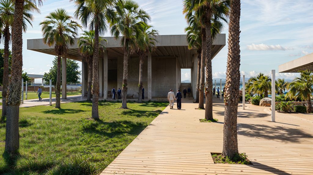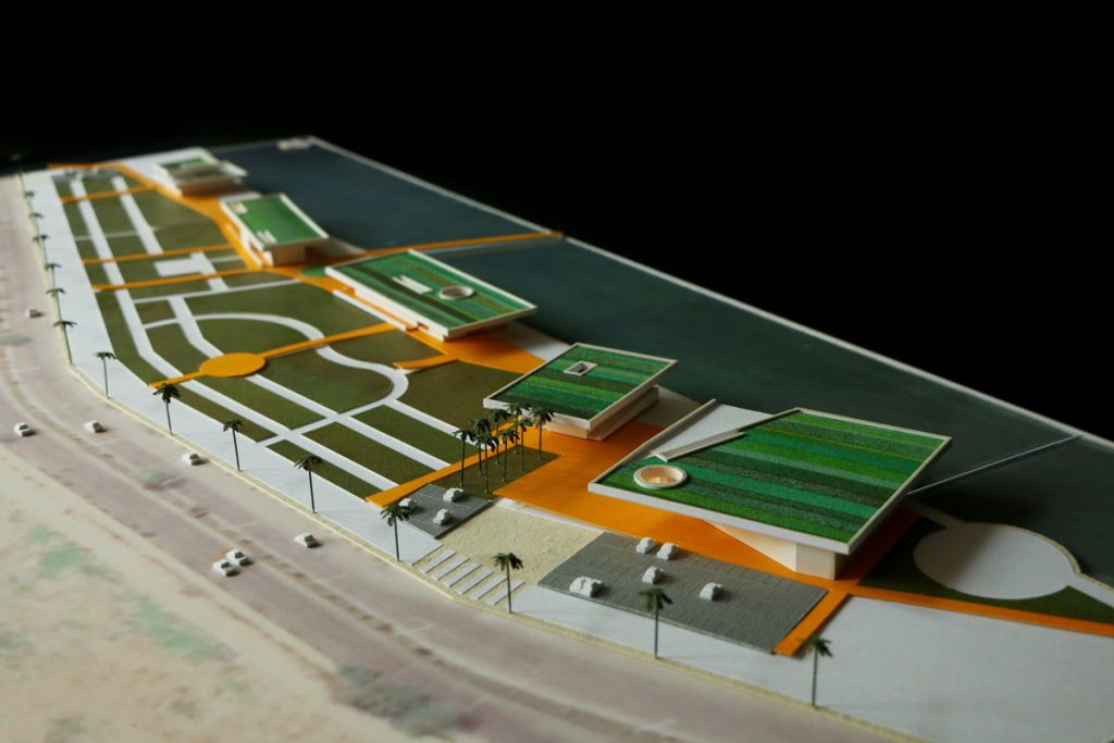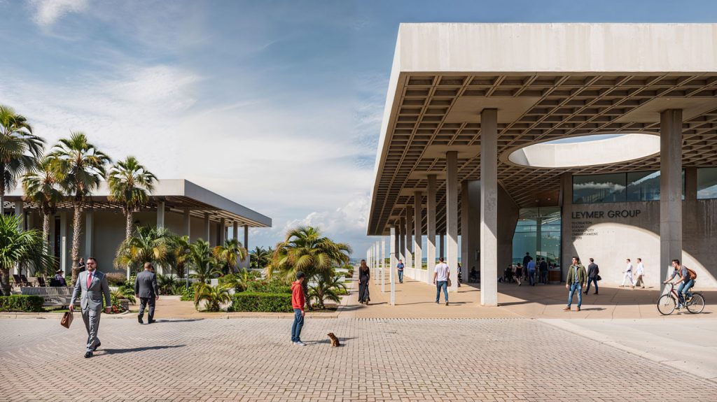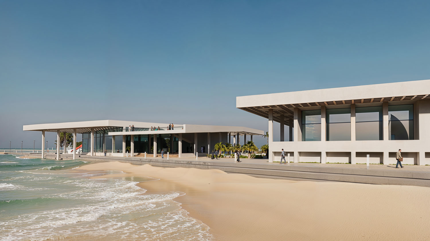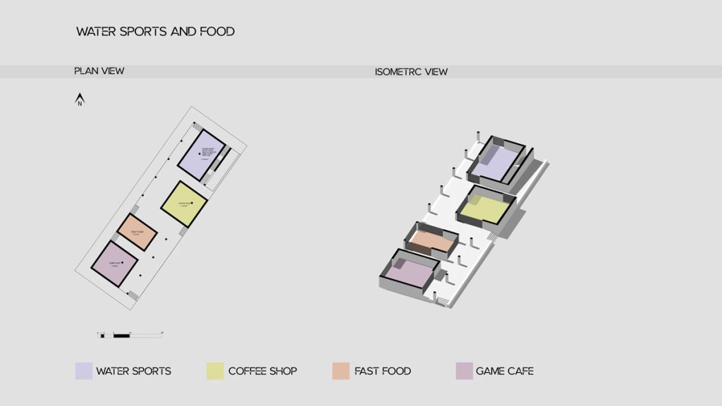 All these functional islands—ranging from digital gaming spaces and cinemas to water sports zones—rest beneath the shelter of “expansive shading roofs,” which, in this climate, define the thin line between habitation and erosion. One of the project’s aspects is the transformation of the roof from a mere shelter into a “productive landscape.”