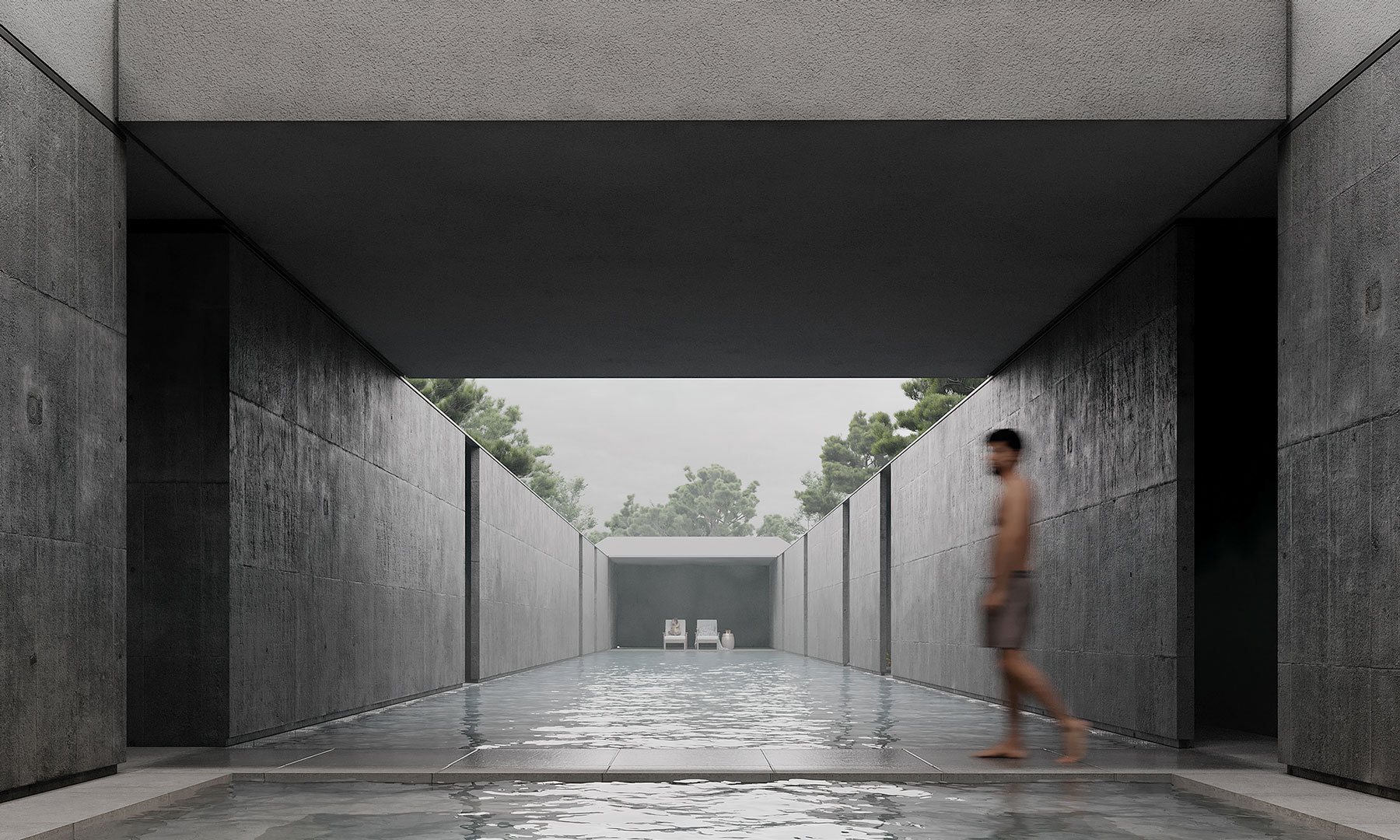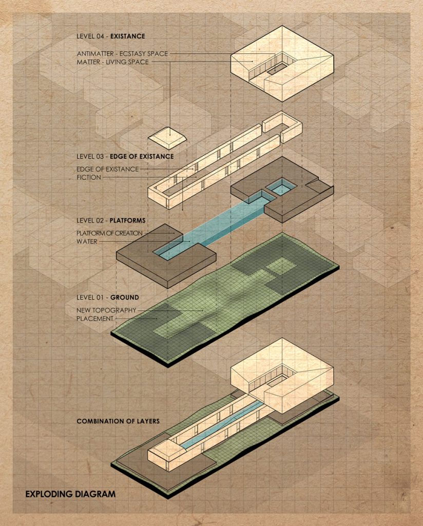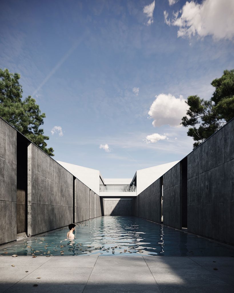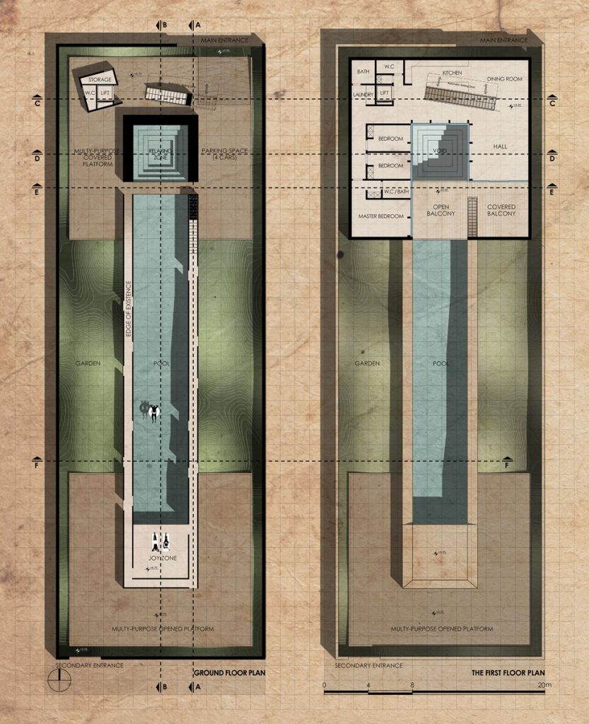 2. The Platform: Two separate platforms were designed for both anticipated and spontaneous activities. One of these platforms creates a covered space for relaxation, while the other becomes an open-air jacuzzi. These two spaces are connected by a pool that allows the flow of life to run throughout the entire plot.